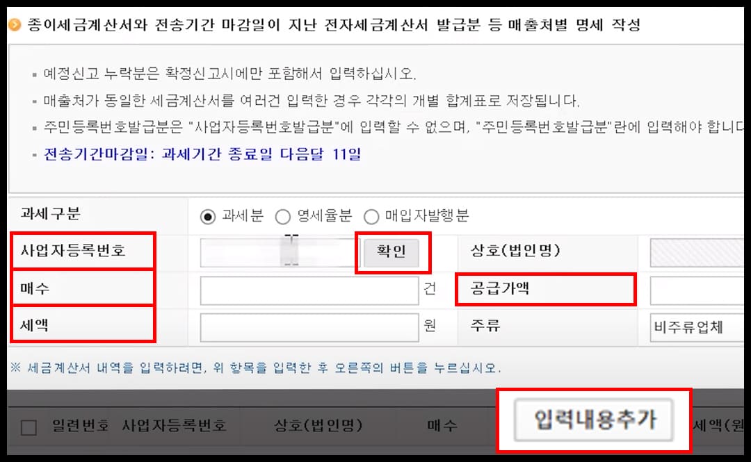 입력을 다 했다면 [입력내용추가] 버튼을 눌러주세요. 종이세금계산서는 다 입력을 해주세요.